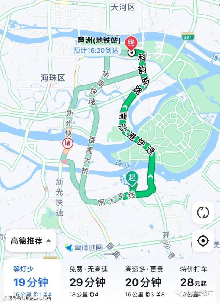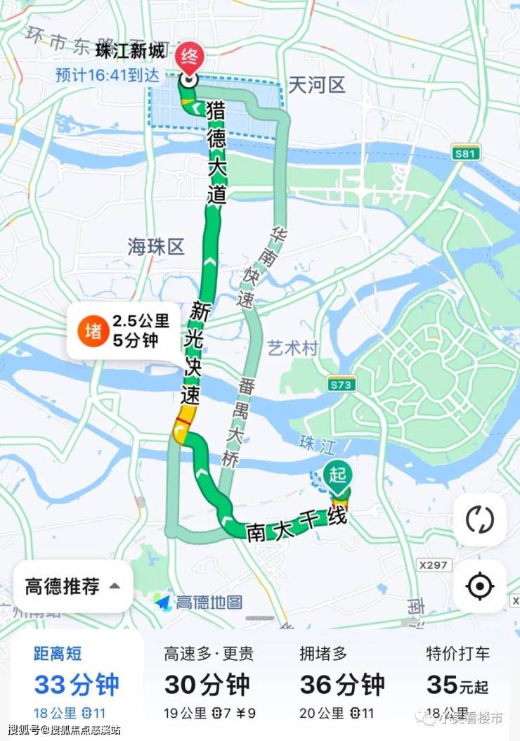 自驾去珠江新城:开上南大干线接新光快速再转猎德大道,全长18公里,耗时33分钟左右,去往珠江新城就没必要上华南快速,时间都差不多,省去高速费,除非是堵车情况下,可以自由切换出行线路。