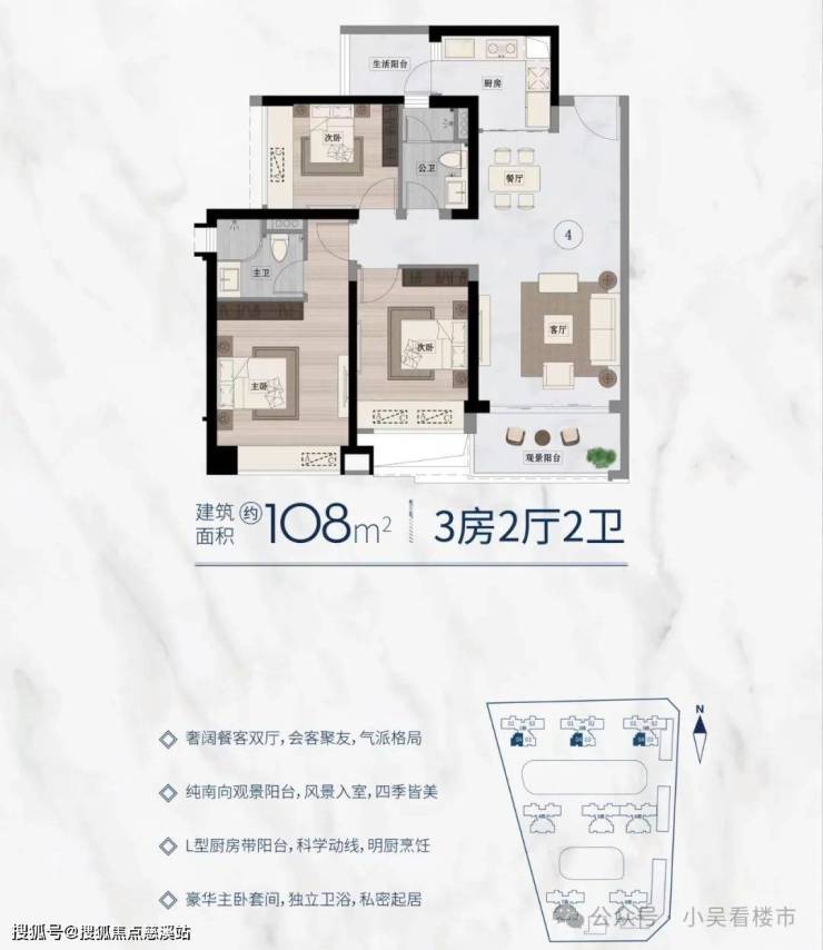 建面108平三房两卫,带主套,纯南向景观阳台,厨房L型,连通生活阳台,总价400-450万左右。