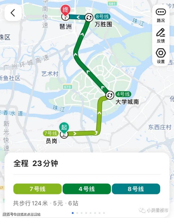 地铁去往琶洲:乘坐7号线2个站到大学城南转4号线,3个站到万胜围再转8号线,一个站到达琶洲,总23分钟,加上小区步行至地铁站的时间,全程耗时30分钟。