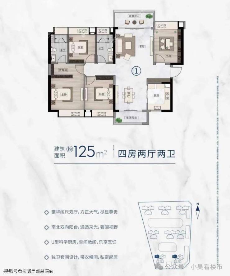 建面125平四房两卫,南北对流双阳台,U型厨房,独立套件设计,总价500-550万左右,目前基本没货。