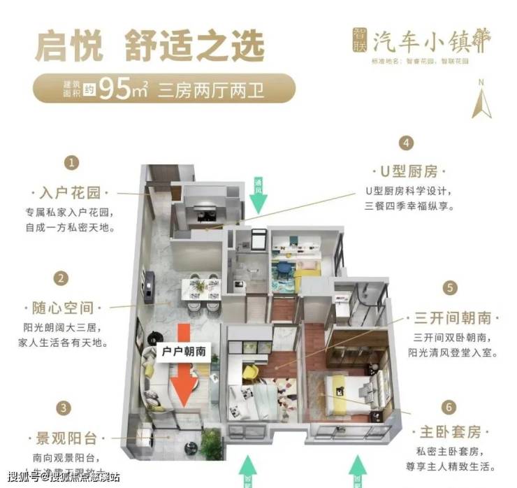 建面95平南向三房两卫,经典竖厅设计,动静分区,带私家入户花园,进门U型厨房,三开间朝南,两个卧室南向,卫生间都是明卫,主卧套房设计,总价205万起!