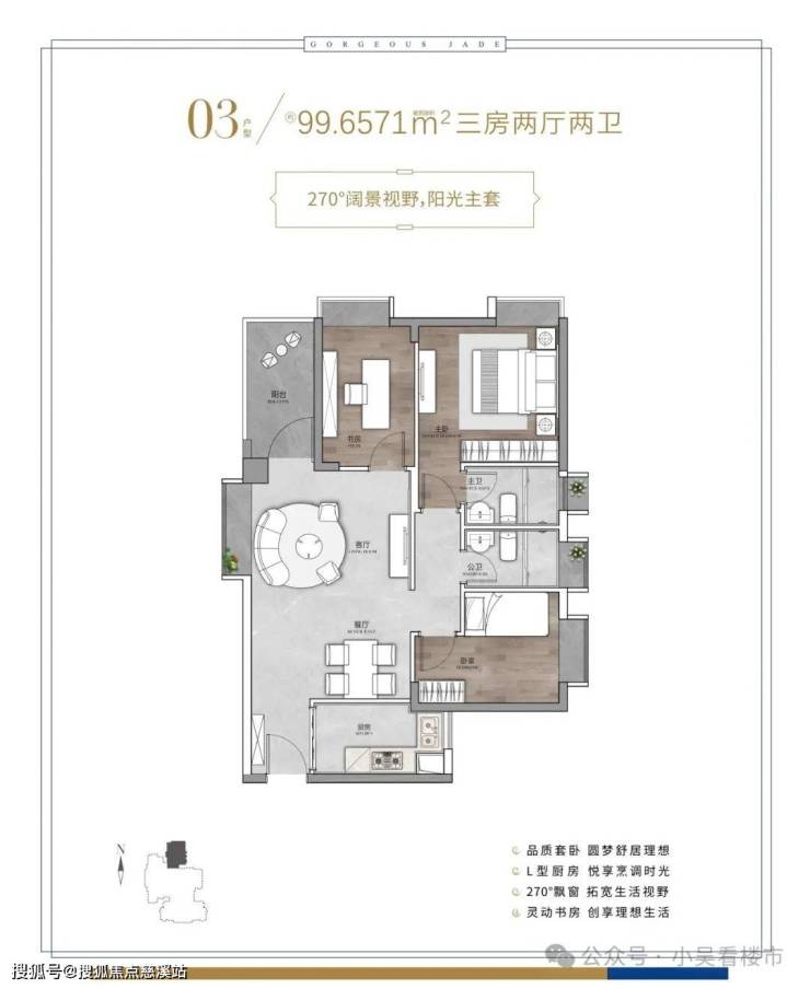 建面98平三房两卫,三开间朝南,全屋通透格局,L型厨房,奢阔主卧,总价450-490万左右。