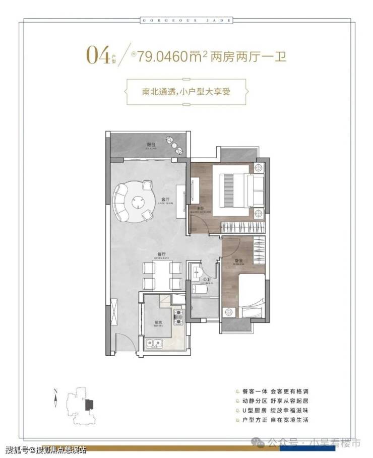 建面79平大两房,动静分区、多飘窗、U型厨房等设计,空间感十足,总价370-410万左右。