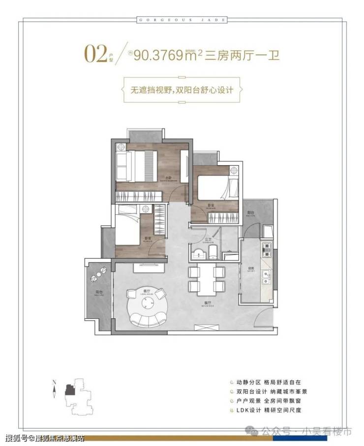建面90平三房一卫,双阳台设计,观景实用两不误,主卧270度飘窗,总价430-450万左右。