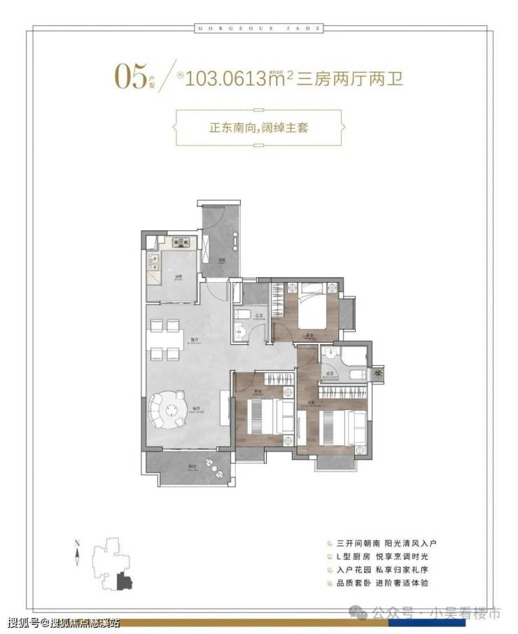 建面103平三房两卫,阔绰的入户花园,可以打造一整面的收纳空间,三开间朝南设计,带主套,总价500万左右。