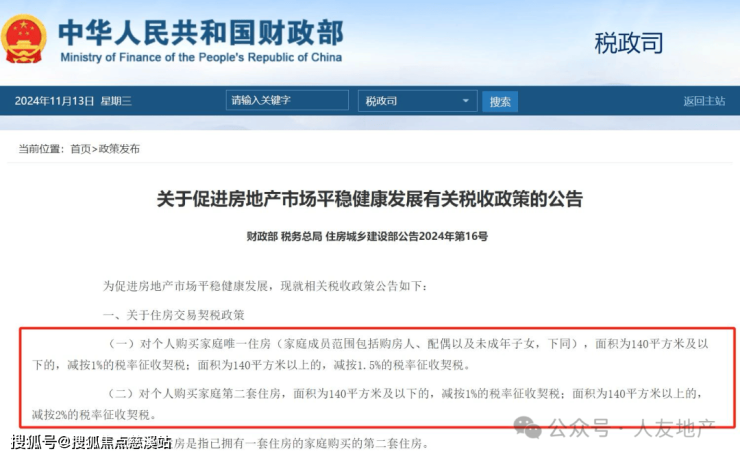 2024年11月13日财政部等三部门发布《关于促进房地产市场平稳健康发展有关税收政策的公告》,政策原文如下: