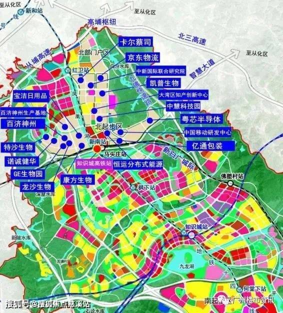 知识城片区划分南中北区,分别规划不同产业集群。北部“互联网+”、绿色产业制造业产业组团;中部现代医学服务、创新金融、高端教育培训、科技服务等服务业组团为主;南部新一代信息技术、文化创意、高端智能装备研发制造和检验检测等生产性现代服务业组团,同时也是整个知识城的居住集中区。目前整个区域注册企业近千家,注册资本超过1061亿,已经汇集了阿里、京东、GE生物医药、宝能新能源等众多龙头企业及大型项目