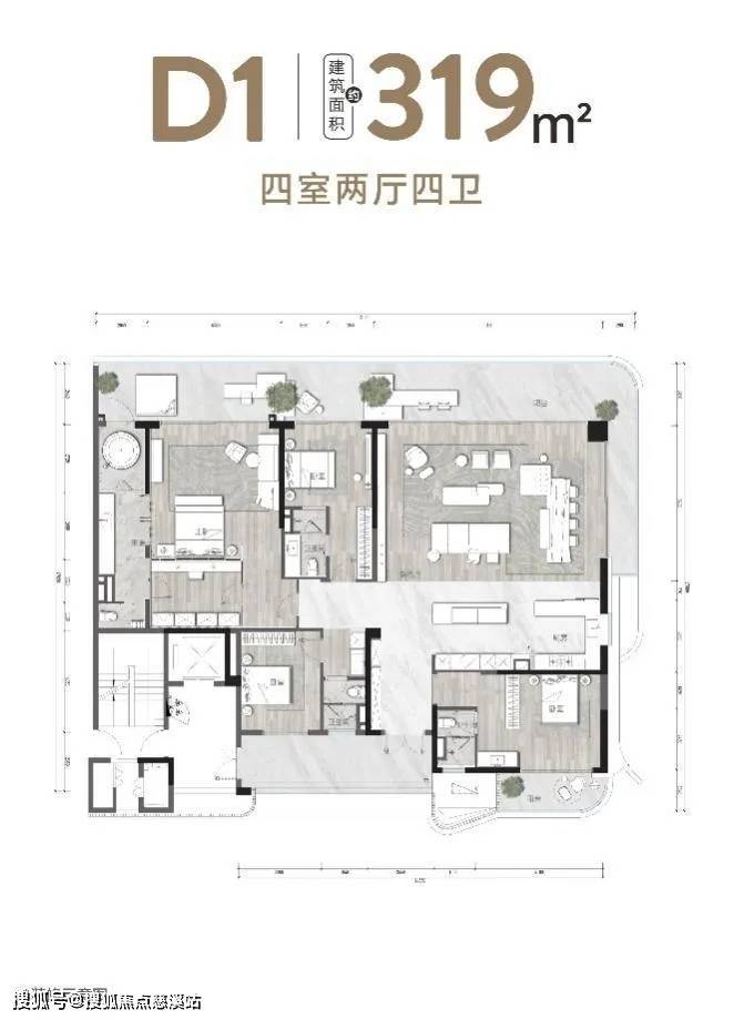 319㎡ 户型为例,四室两厅四卫格局,为高端家庭拓阔生活尺度;