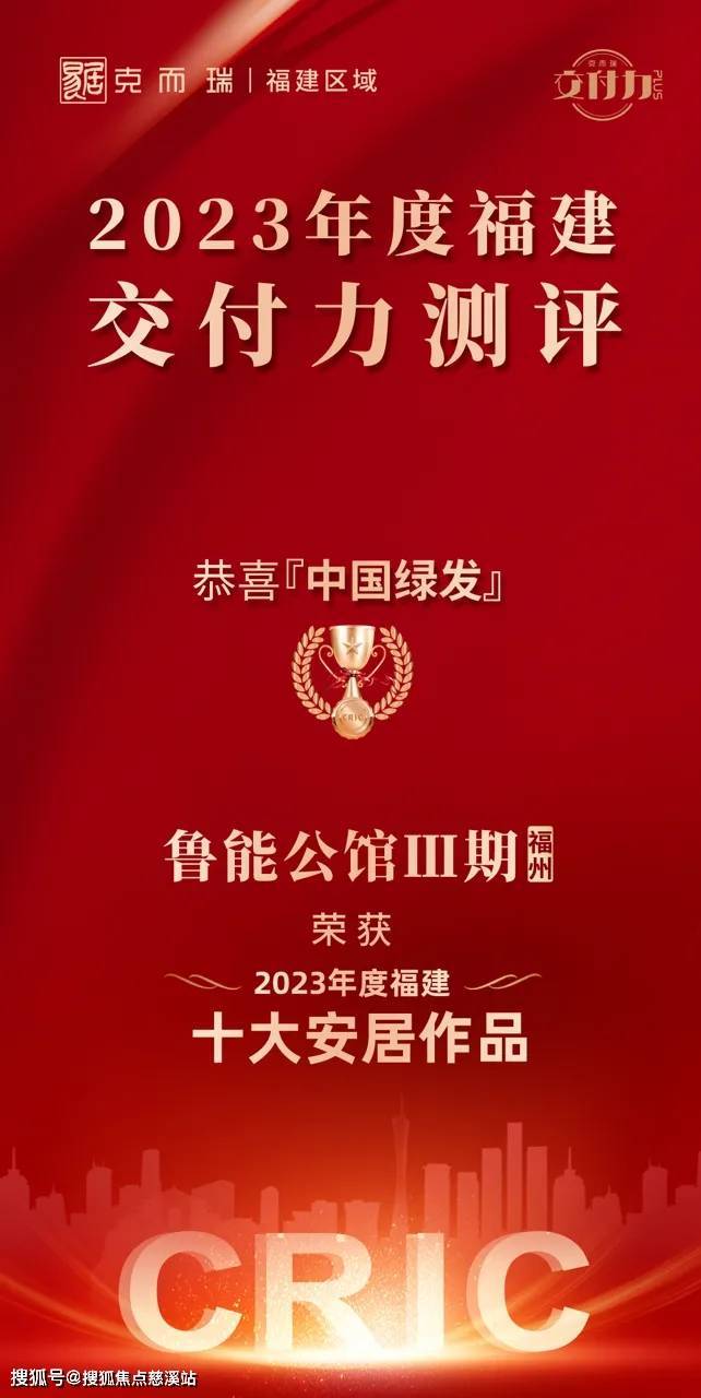 围绕项目总体交付指标、室内空间、公共区域、建筑立面、园林景观、社区设施、服务体系等维度进行全面测评并评定,鲁能公馆Ⅲ期荣获“克而瑞2023年度福建十大安居作品”。