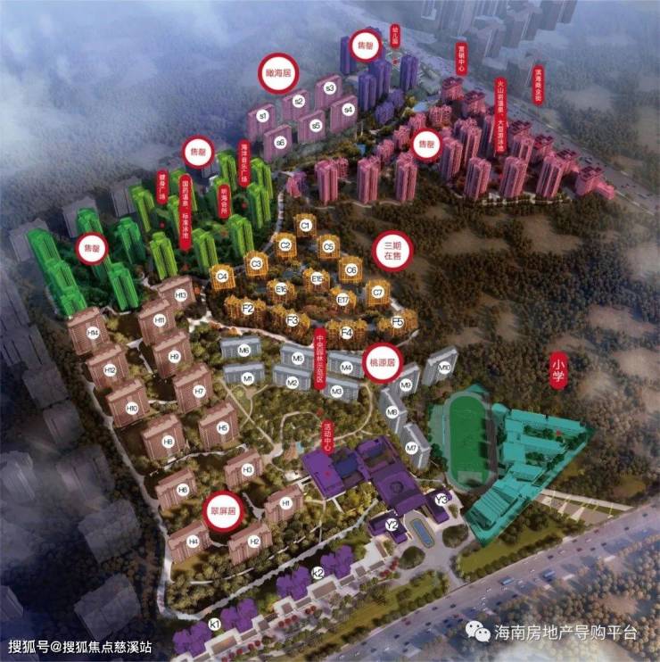 新组团占地190余亩,总建面约19万㎡。一组团“翠屏居”为14栋小高层;二组团“桃源居”由6栋洋房和4栋小高层组成;三组团“瞰海居”为6栋海景小高层。均采用纯正滨海建筑风格。
