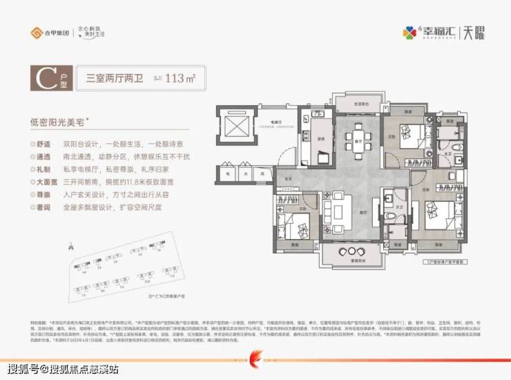 113 ㎡三房:南北双阳台,独立玄关+衣帽间。