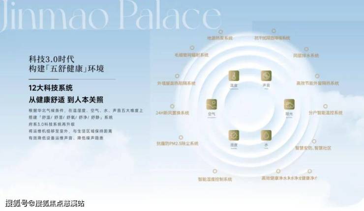 12大绿金科技:始终从“温度、湿度、空气、阳光、水”六大基本生命元素出发,为每一位金茂府业主营造舒温、舒湿、舒氧、舒静、舒净的居住环境。