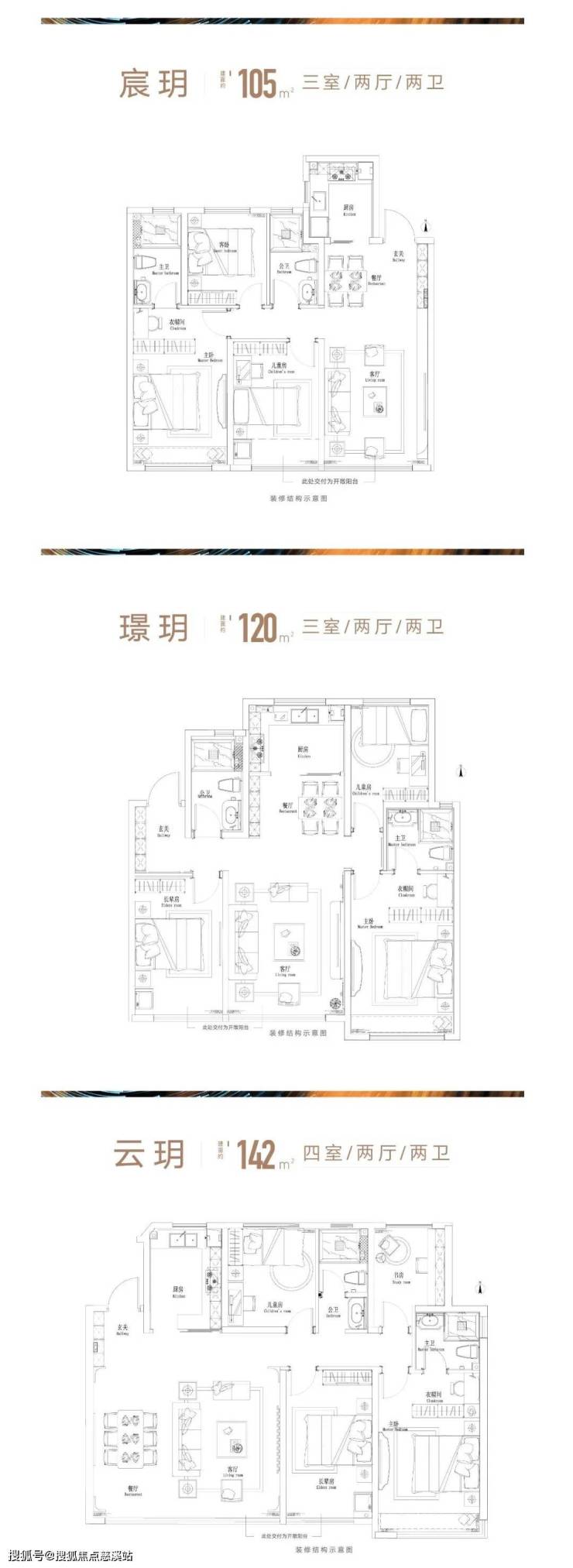 户型设计充分考虑现代家庭的生活需求,建面约105-142㎡都会革新力作,突破传统户型尺度边界,创变式户型设计,随家庭成长,切换空间分割,满足业主所需。进深约2.1m、最宽约9.3m宽幅阳台,最大化给予生活与城市、自然的对话。创新LDKG设计,将餐、客、厨、阳台一体化贯通,最大化家庭社交空间。阔尺主卧套房、双卫设计、元宝户型(建面约120㎡户型)等舒居细节拉满,迭代都心家庭生活想象。