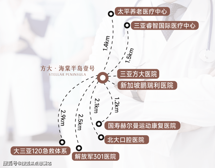 项目周边汇聚解放军总医院海南分院、北大口腔医院三亚分院等顶级医疗力量,更规划建设三亚方大医院(2026年开工),社区直接引入该医院优质医疗资源,在建筑布局中预留康养空间,实现“医疗+康养”无缝衔接,让健康管理成为日常生活的重要组成部分,真正达成康养旅居闭环。