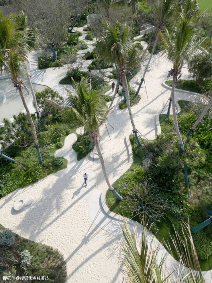 落客区域景观利用构筑空间、植被等微环境要素进行场景切换。迎面而来的是度假风情十足的老桩鸡蛋花和椰子树,灌木植被丰富多彩。景观廊架由几个伞状结构组成,其竹编艺术品表皮不规则而错落,既提供遮荫也透出斑驳的光影,增添放松而优雅的度假氛围。