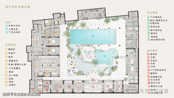 约3000㎡下沉式会所涵盖成人泳池、儿童泳池、健身房、私宴餐厅、下沉酒吧等多样邻里复合功能,满足业主社交、健身等多种需求。