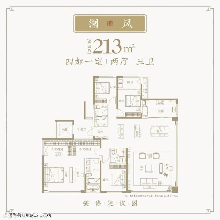 建面约213㎡大平层户型,三开间朝南,公共活动空间十分宽敞,且动线流畅。两套间+两普通卧房,一家老小住足够了。