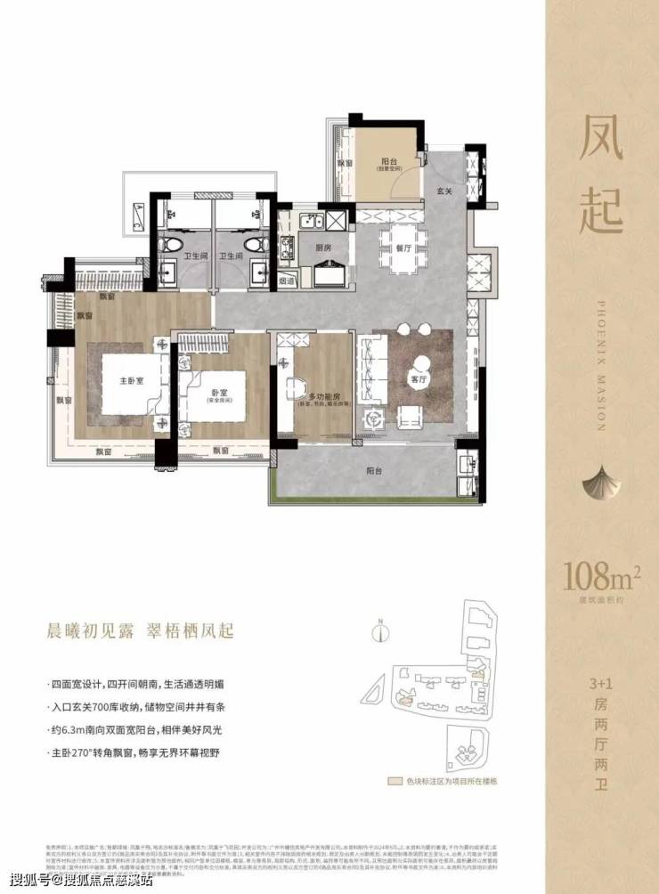 凤起·建面约108㎡ 3+1房两厅两卫,南向四开间,约6.3m双面宽阳台