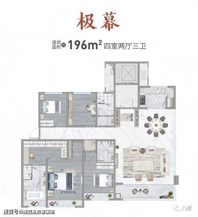 196㎡四房2厅3卫的设计,一梯一户保证了主人居住的私密性,电梯口的公共区域也是业主的可利用空间,同时保证了二进制归家礼遇。整体南向面宽达到了15.5米左右,大尺度改善型产品,塔尖成功人士才可享有如此的尺度感及舒适度。