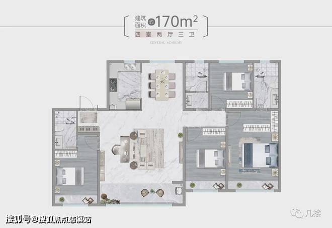我个人最喜欢170㎡户型,完美的四面宽+大宽厅户型,约15.85米超大五面宽、约6米巨幕落地窗,餐厅客厅阳台一体化设计,完美通透,南向双套房设计,一家三代完美的空间布局。