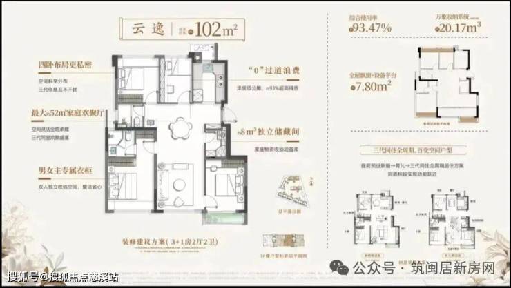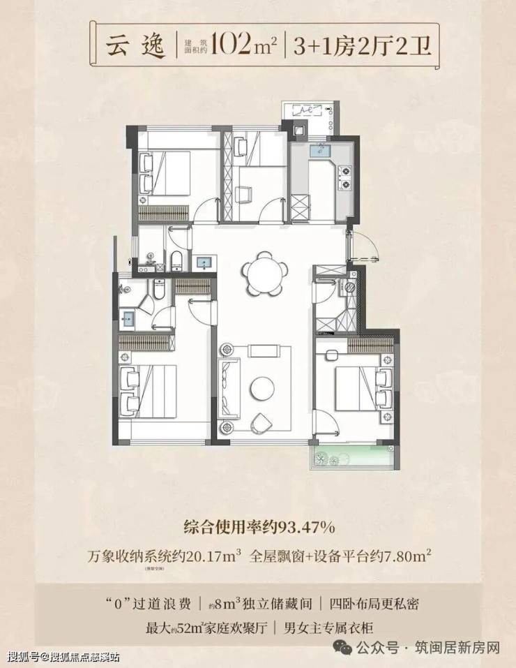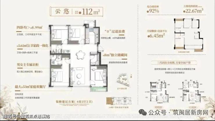 超高得房率是其最大亮点:89㎡得约91%,102㎡得约93.5%,112㎡得约92%。