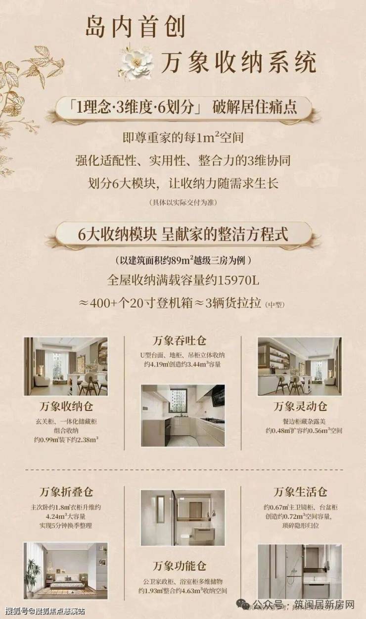 岛内首创的屋顶花园(1、2、6#楼栋配备)和万象收纳系统也是重要卖点。