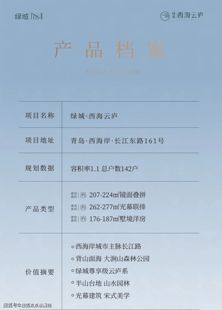 绿城城·西海云庐,云庐系经典之上的传承与 迭新,以约1.1超低容积率的院墅型制,规 划建设光幕联排、镜面叠墅及墅境纯洋房产 品,仅142席。