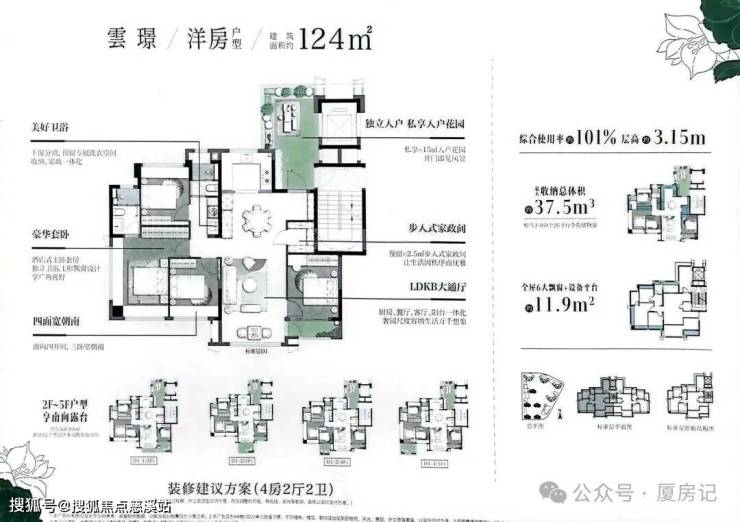 •124㎡洋房独门独户带入户花园,2至5层部分位置有南向晒台,综合使用率达101%-109%
