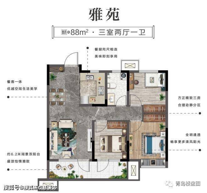 ★百变空间:入户前室独立赠送空间,拓宽幸福的尺度;南向大面宽双阳台,为生活意趣营造多元空间,全明通透,大面积采光,闲时沐浴阳光,侍弄花草,在柔软的沙发上闲度午后;阔绰餐客一体空间,安放下老友欢聚的热闹