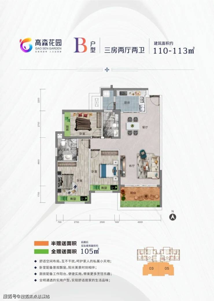 - 面积数据:建面约110-113㎡,实得面积约95-97㎡,拓展后可用面积约105㎡