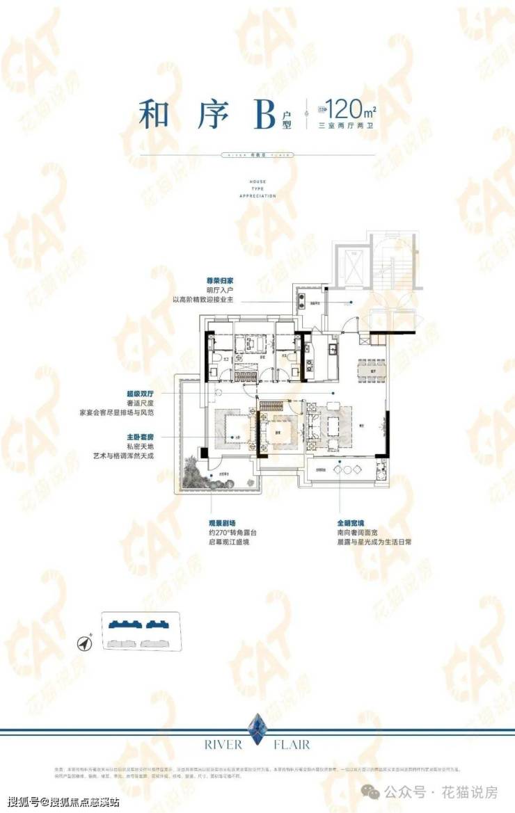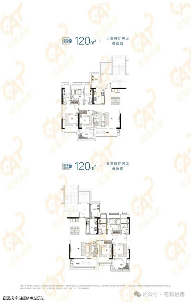 下图是120㎡户型,这个户型设计的也非常不错,三室两厅两卫设计,边户的主卧同样带270°转角挑空大露台,视野绝佳。中间层偶数层露台在次卧外,奇数层露台在主卧外。
