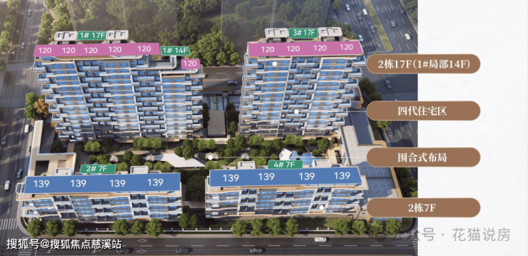 中建江海和鸣共规划4栋住宅202户,其中1、3号楼为17F高层(1号楼局部14F),户型为120㎡;2、4号楼为7F洋房,户型为139㎡。