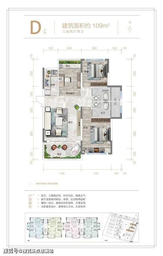【优居户型】 海棠壹号院全新迭代建筑面积约109-119㎡升级户型,空间布局科学合理,全明户型,南北双阳台,270°环幕视野,重新定义高端品质人居尺度。A 户型109㎡两室两厅两卫