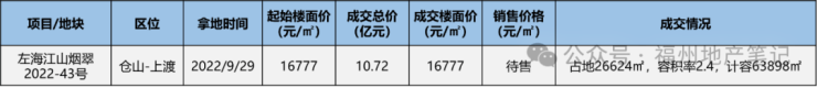 2022年9月29日左海以底价10.72亿竞得2022-43号地块,楼面地价16777元/㎡,当初市场来看,地价不算太高,毕竟火葬场的【龙湖九里晴川】当年售价约为2.5万元/㎡,月均卖25套左右。