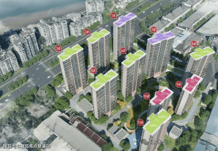项目主要营销点为“一脉闽江、文脉纵轴烟台山”。项目限高70米,容积率约2.4,规划2栋小高+8栋高层,合计403套住宅,规划机动车位612个。社区行列式布局,北侧楼栋结合底商等,内部楼栋全架空。