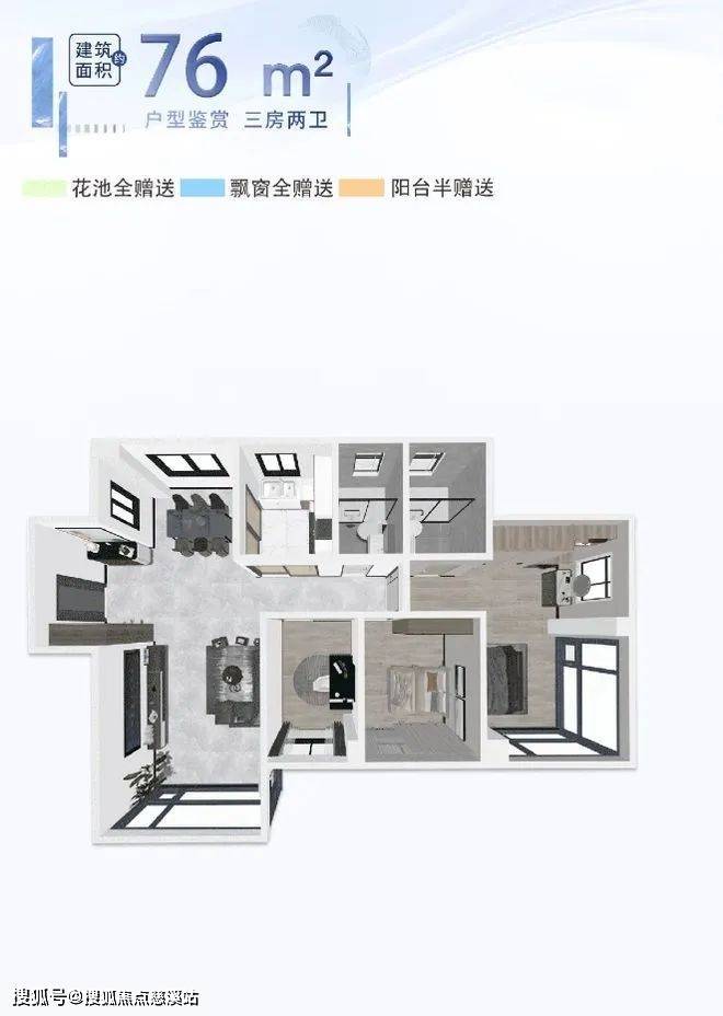 :四房设计,进一步拓展了居住空间,适合对居住空间有更高要求的改善型刚需人群,全南向双卫设计保证了充足采光与居住便利性。