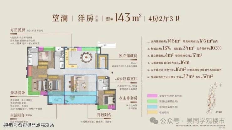 143㎡奢华配置型(4 房 2 厅 3 卫):22㎡正式餐厅提升生活仪式感,三卫分离设计(主卫 + 公卫 + 客卫)保障多代同堂的私密性,次主卧套房避免家人干扰,再加上 6 米宽厅的南北通透格局,妥妥的 “终极改善之选”。