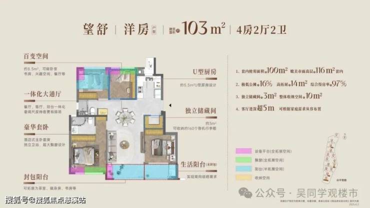 103㎡紧凑精品型(4 房 2 厅 2 卫):得房率 97%,推售占比 23%。U 型厨房最大化利用操作空间,客餐厅与阳台一体化设计增强通透感,还自带约 3㎡独立储藏间,完美解决小户型 “收纳难” 问题,适合首次改善家庭。