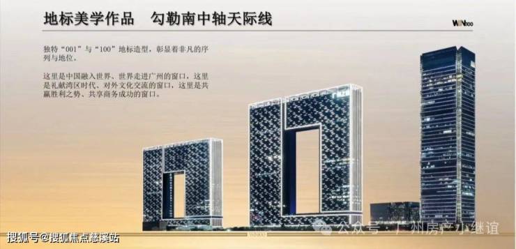 广州之窗·WIN100,整体建筑造型,自南向北看呈“001”的造型,代表着第一;自北向南看呈“100”的造型,代表着100满分,成为了时代精神的象征与珠江畔耀眼的地标建筑。