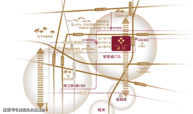 地铁——约800米达广州地铁21号线(已开通)和10号线二期(规划中)交汇的天河智慧城站;约600米达10号线二期软件路站(规划中);约300米达29号线大观中路站(规划中);毗邻东环城际(建设中)智慧城站,接驳机场及广州南站;