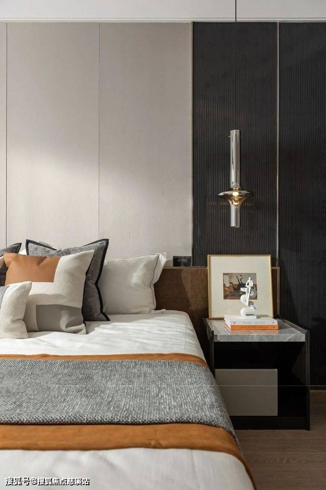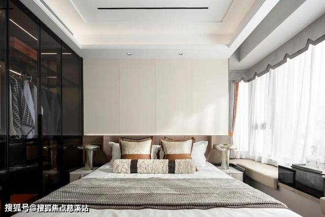 大飘窗让自然光柔和地洒进来,映射出绝佳的光感;暖意舒适的床品给你一晚好眠,顶天立地衣柜足够装下主人参加宴会派对的华美礼服;床尾的黑色悬空台面与悬空柜组合,可作为梳妆台又有艺术美感。