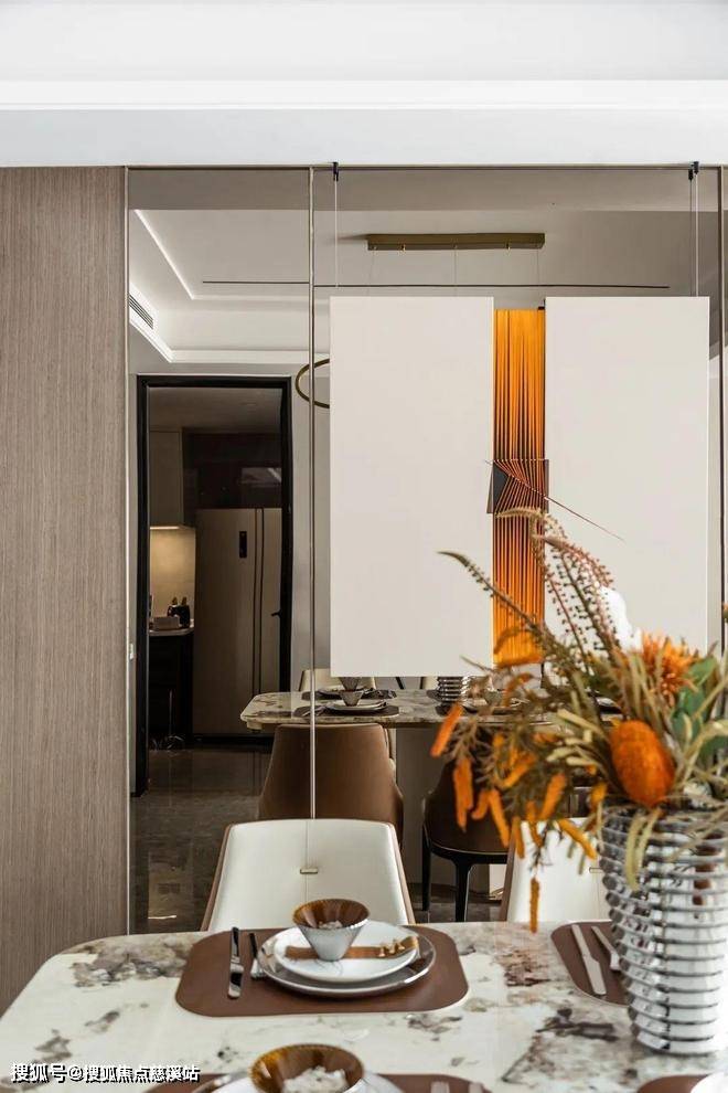 餐厅将材质的丰富与层次感表现到极致,纹路典雅的大理石桌面,色调高雅的皮革餐椅,精致考究的金属餐具,缀以配色大气的插花,复而不繁低调雅奢。