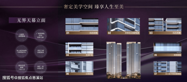 大面积玻璃幕墙+金属铝板+汤臣一品同款栏杆,飘窗下沿采用国内先进玻璃下包工艺,搭配类幕墙窄窗框及高窗墙比,带来超大屏的采光面和观景视野,以灵动曲线勾勒楼体线条,呈现出动态美感,惊艳于时代的品位。