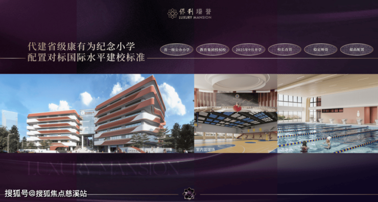 保利斥资约2亿全资代建省一级康有为纪念小学(36班公办学校,2025年9月开学),步行可达。教学配置高,对标国际水平的建校标准,室内配备游泳馆、报告厅、图书馆、篮球馆等,室外坐拥400米标准环形跑道,足球场等设施;