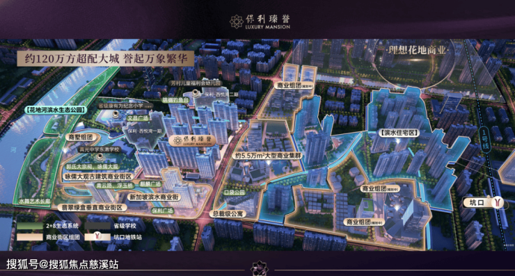 保利作为花地湾片区连片开发最重要的城市运营商,打造约120万方超配大城,涵盖了高端住宅、酒店、滨水商业街区、公寓、文化等多为复合业态,实现真正意义上的超配大城。