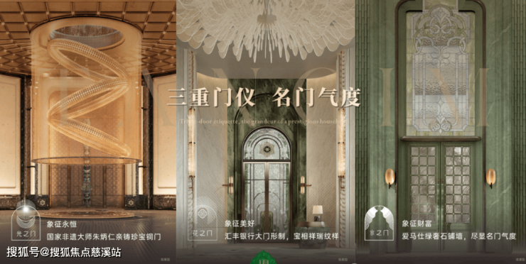 【三重门仪】光之门由国家非遗大师朱炳仁亲铸珍宝铜门象征永恒,花之门以宝相祥瑞纹样寓意美好,水之门以爱马仕绿彰显财富气度,复刻名门归家仪制。