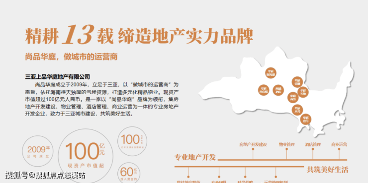 三亚上品华庭地产有限公司成立于2009年,公司实际投入资金约60亿元人民币,现资产市值超过100亿元人民币,已开发项目总面积近百万方。公司以“尚品华庭”品牌为领衔,集房地产开发建设、物业管理、酒店管理、商业运营为一体的专业房地产开发企业。
