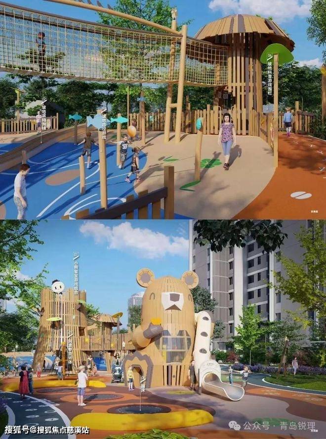 其中约3300㎡的森悦乐园是园区打造的重点。毕竟,孩子是公共空间的活力之源,也是在此逗留最久的群体。这里有让每一个孩子爱不释手的各种游乐设施,滑梯、攀爬架、跷跷板、传声筒、峡谷吊床等等。