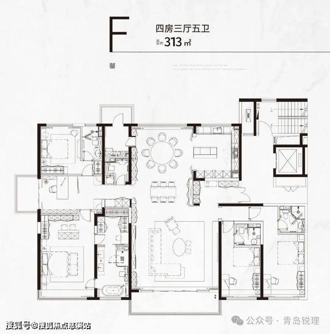 以建面约313㎡户型为例,瞰山观海揽生活,坐拥一线石老人海景、浮山美景是整个户型最大的亮点。整个户型由巨幕宽景阳台+西向景观阳台+北向生活阳台共同构建起360°环幕视野,并且无论是在宽敞的客厅、静谧的卧室,还是书香四溢的书房,每个角度都呈现出如电影般震撼的视觉盛宴,让人仿佛置身于自然景观的巨幕之中。