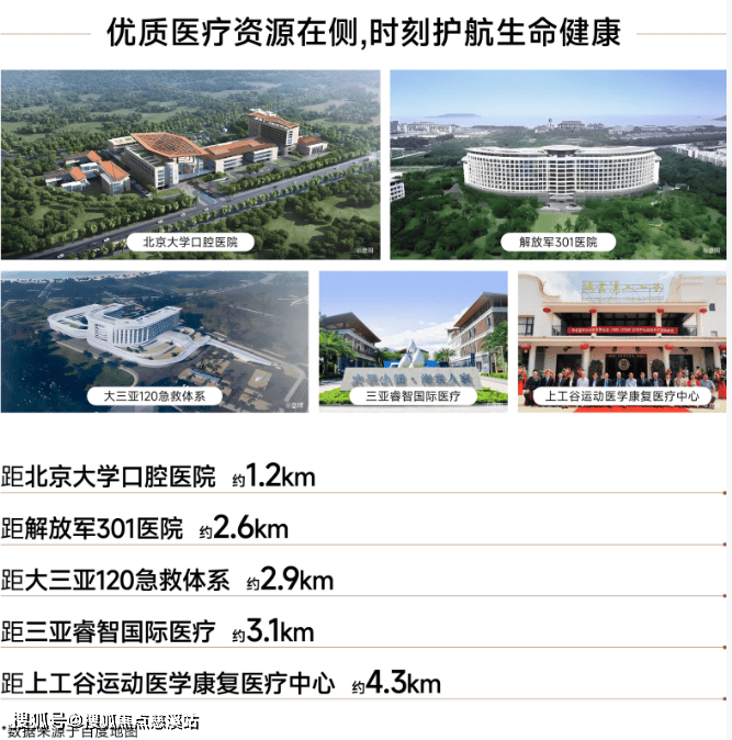 解放军301总院海南分院、北大口腔医院、赫尔曼运动康复医院、上工谷运动医疗康复中心等,业主享全维度医疗资源环伺,为健康筑起安心屏障。